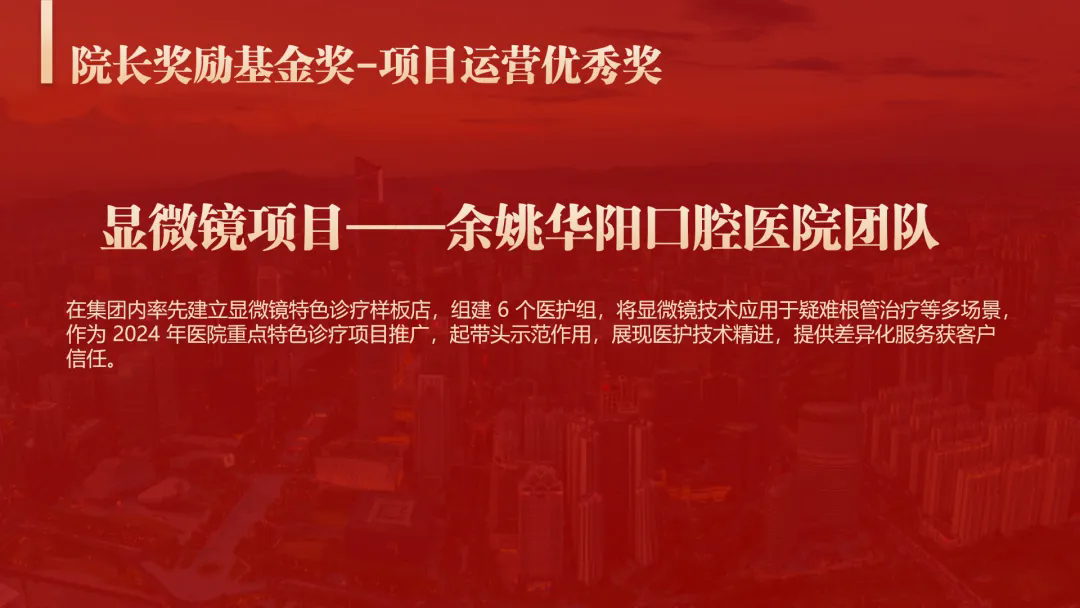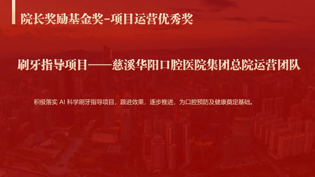 舒緩而激昂的音樂響起,大屏幕上緩緩拉開 2024 年的奮斗長(zhǎng)卷,將大家的思緒拉回到過去的一年。這一年,慈溪華陽(yáng)口腔醫(yī)院的每一步都堅(jiān)實(shí)有力, 一張張照片串聯(lián)起全體華陽(yáng)人在過去一年的汗水與榮光,見證著慈溪華陽(yáng)口腔醫(yī)院為口腔健康事業(yè)全力以赴的決心。