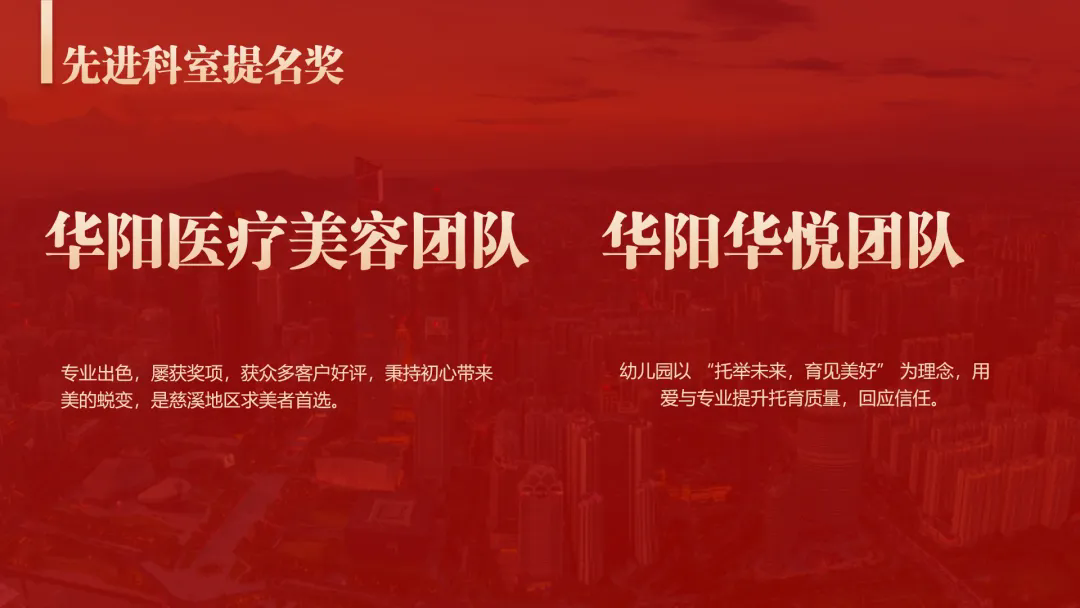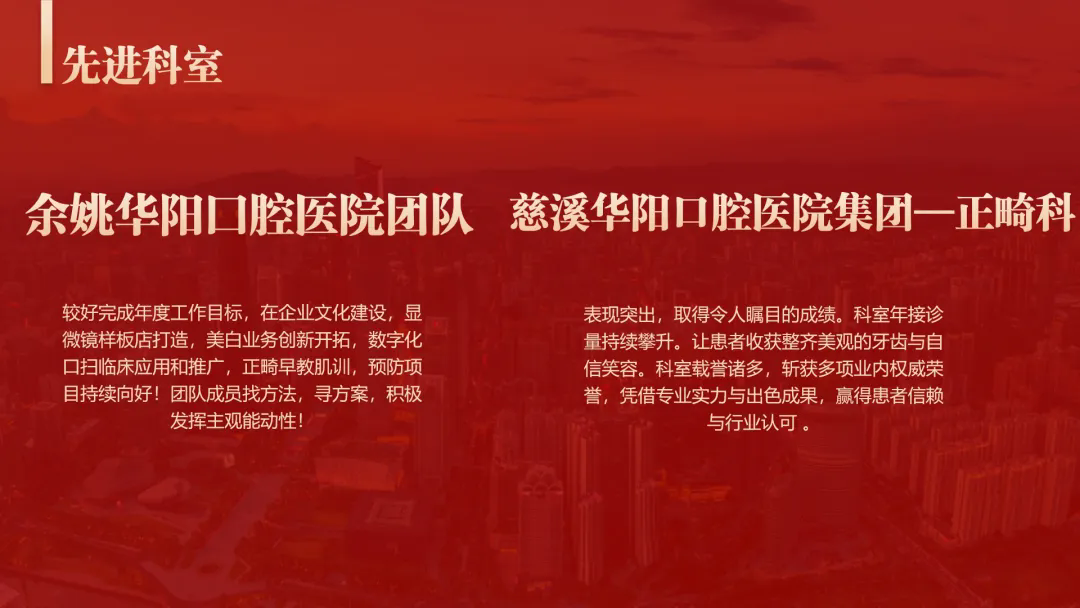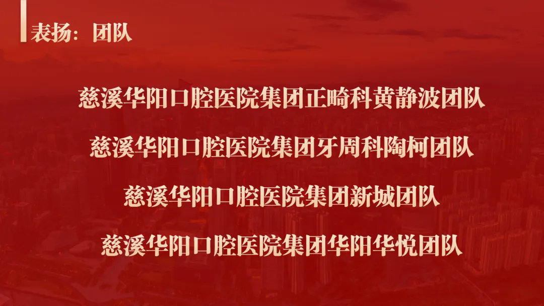 緊接著,會(huì)場(chǎng)的燈光漸次暗下,所有人的目光聚焦在大屏幕上,慈溪華陽(yáng)口腔集團(tuán)總院、余姚華陽(yáng)口腔醫(yī)院、慈溪華陽(yáng)口腔醫(yī)院虞北門診部、逍林門診部、新城門診部、杭州灣門診部、觀海衛(wèi)門診部、寧波瑞閣口腔、華陽(yáng)華悅教育團(tuán)隊(duì)向大家送上最真摯的祝福!